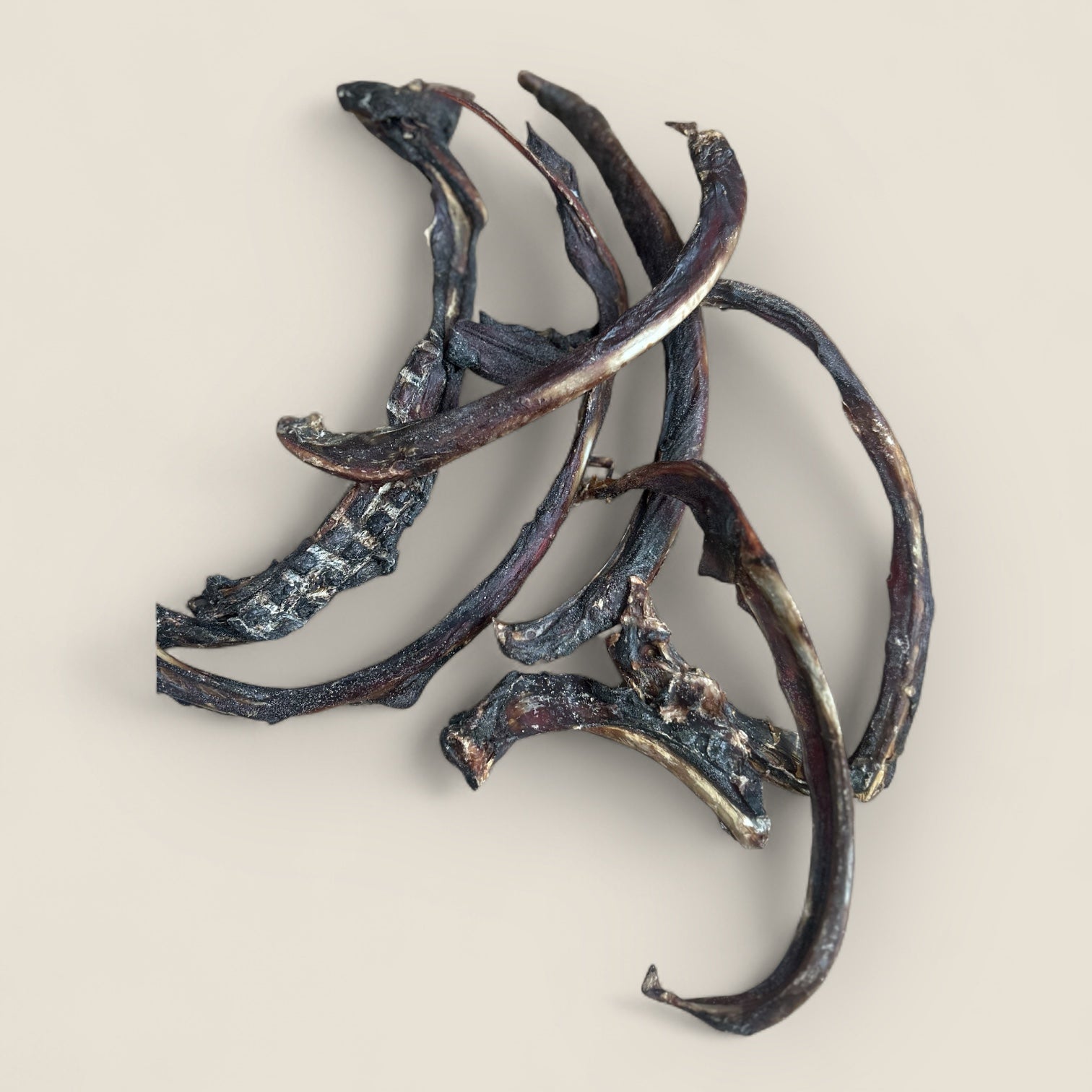 packed with iron, calcium and protein. plenty of meat on the bone to help with plaque and tartar formed on teeth, improving overall dental health. bones are slowly dehydrated at low temperatures so bones do not calcify.
